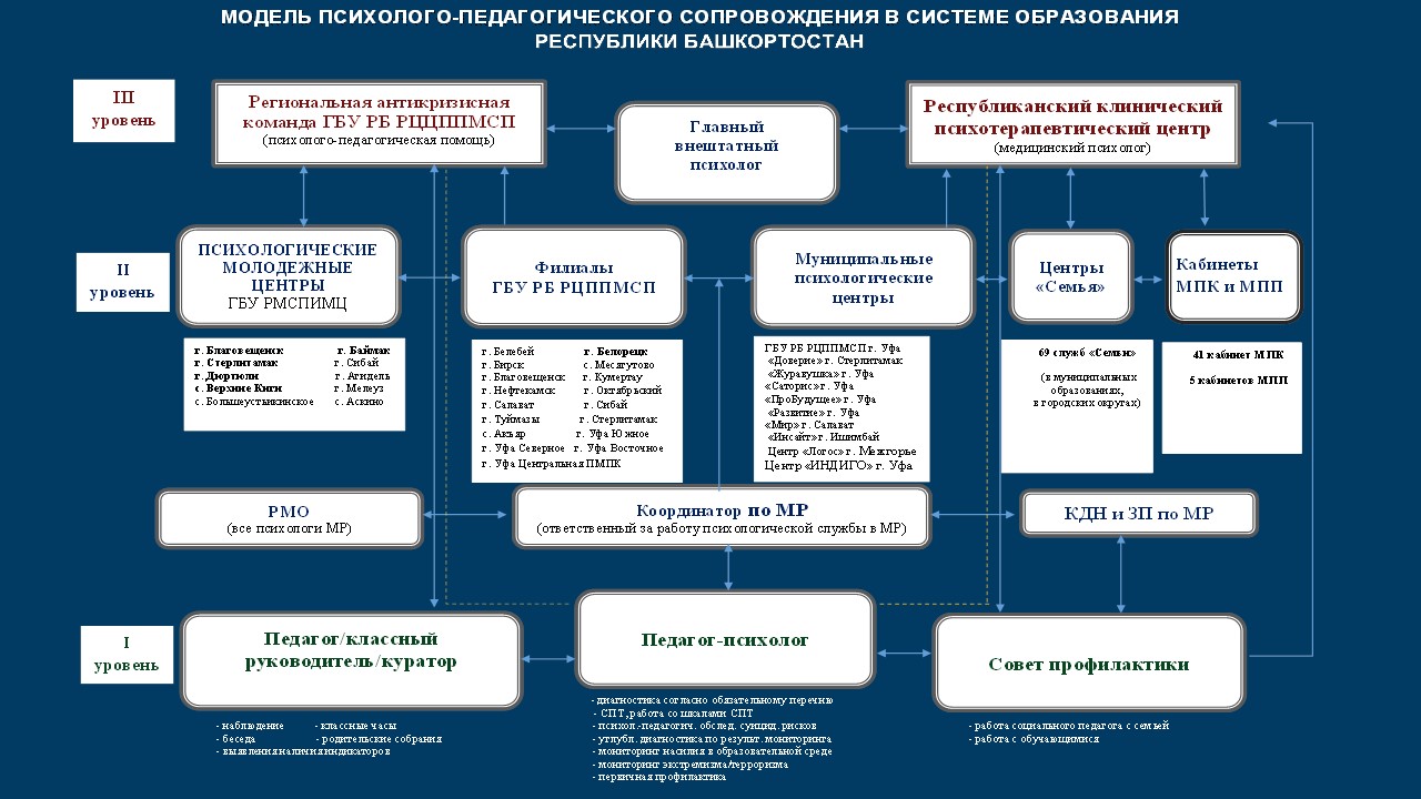 Содержание и преемственность практической деятельности педагогов-психологов образовательных организаций разных типов и видов и ППМС-центров в Республике Башкортостан обеспечивается совокупностью взаимосвязанных и взаимодополняющих ступеней психолого-педагогического сопровождения, психолого-педагогической, медицинской и социальной помощи.